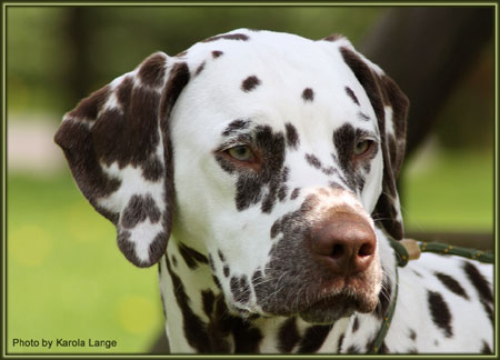 "Silas" besticht durch seine herausragend harmonischen Gebäudelinien, die im Stand wie auch in der Bewegung Geschmeidigkeit, kraftvolle Eleganz und einen athletisch bemuskelten Körper miteinander vereinen mit ausgesprochen viel rüdenhafter Ausstrahlung, Charisma und Adel. Er ist ein völlig in der Balance und 100 % im richtigen Rechteckformat (9:10) stehender, sehr knochenstarker, vorzüglich proportionierter und kräftig bemuskelter Rüde von hervorragender Substanz, mit vorzüglich saftigem Pigment. Vorzüglich typvolles Kopfmodell mit voll durchpigmentiertem Augen- wie auch Nasensaum, bernsteinfarbiges Auge, komplettes, kräftiges Scherengebiss, korrekt angesetzte und getragene gefleckte Behänge, trockener, sehr edel aufgesetzter, langer Hals, der schwungvoll in den stark ausgeprägten Widerrist übergeht. Er verfügt über eine ausgesprochen exzellente Brusttiefe mit vorzüglicher Bemuskelung der Vorbrust und Schulter. Schulter und Oberarm befinden sich in einem ausgezeichneten Winkel. Sein Rücken ist gerade und fest mit ausgesprochen korrekt gelagerter Kruppe, äußerst harmonische, einwandfreie Ober- u. Unterlinie, korrekte Rutenhaltung im Stand, wie auch in der Bewegung, exzellente Winkelung der Vor- und Hinterhand, vorzüglich und kräftig aufgeripptes Gebäude, vorzüglich verteilte Fleckung in sehr gutem Abstand stehend und von sehr guter Größe, kräftige, runde, vorzüglich aufgeknöchelte Katzenpfoten, ausgesprochen kraftvolles, raumgreifendes, gleichmäßig paralleles Gangwerk in der richtigen Trittfolge, geht mit Temperament und kontrolliertem, kraftvollem Schub aus der Hinterhand.