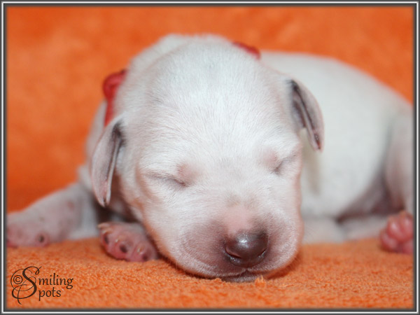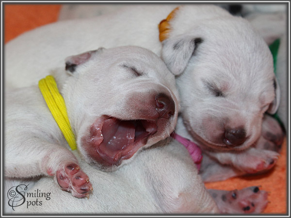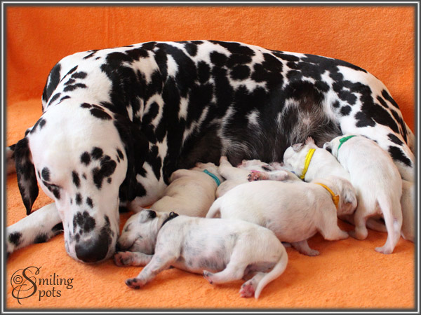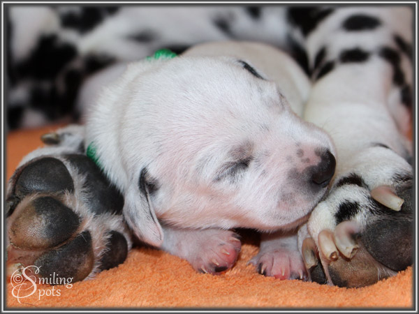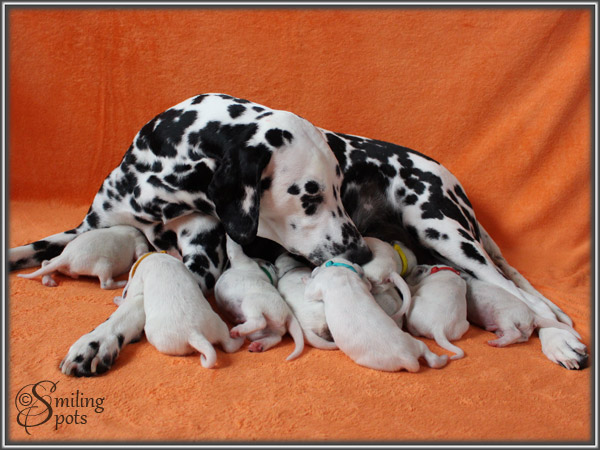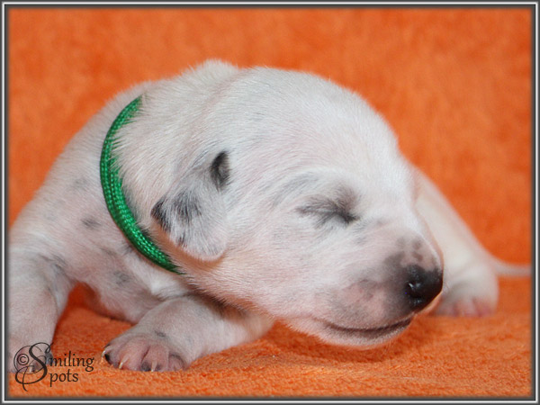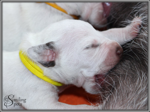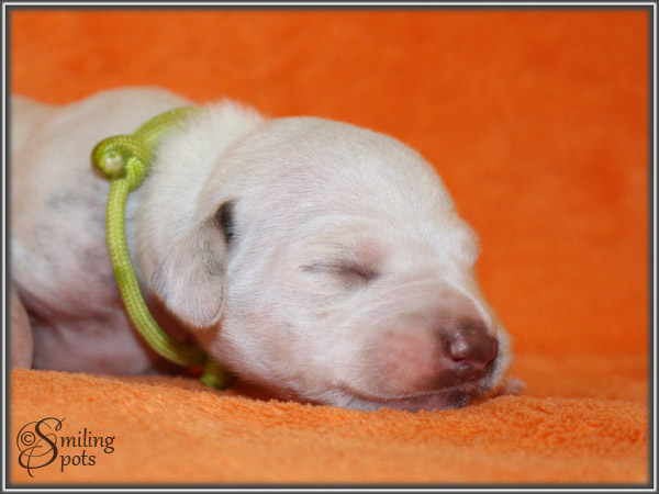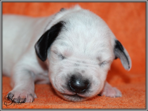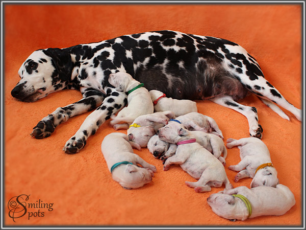 Hey Leute! Ich bin's "Everlasting Fighter Heart of the Smiling Spots", hier werde ich aber nur "Schwarzohr" genannt. Meine Geschwister und ich sind schon 1 Woche alt. Dank Mama's 24/7 geöffneter Milchbar, haben wir schon richtig gut zugenommen. Momentan ist unser Alltag aber noch ziemlich eintönig. Wenn wir nicht gerade Milch trinken, dann träumen wir ganz schön viel - was verrate ich euch aber nicht :-) Mama ist ab und zu immer mal wieder unterwegs... Wenn uns das zu lange dauert, dann machen wir uns lautstark bemerkbar. Bellen können wir nämlich schon ganz gut. Aber wir sind ja auch schon "groß", da können wir mal einen Augenblick alleine bleiben. Mit unserer Geburt hat ja auch ganz plötzlich der Sommer eingesetzt. Deshalb versucht Mama uns irgendwie ein kühles Plätzchen "zu bauen", bisher hat Frauchen sie aber davon abgehalten... Papa hat Mama übrigens die schönen Bändchen zu unserer Geburt geschenkt, damit ihr uns alle auseinander halten könnt. Mama kümmert sich super um uns - Tag und Nacht!! Mama ist und bleibt eben einfach die BESTE! Soo, nun muss ich aber auch wieder los; Mama-Milch trinken - will ja schließlich mal in Papa's Pfotenstapfen treten können...